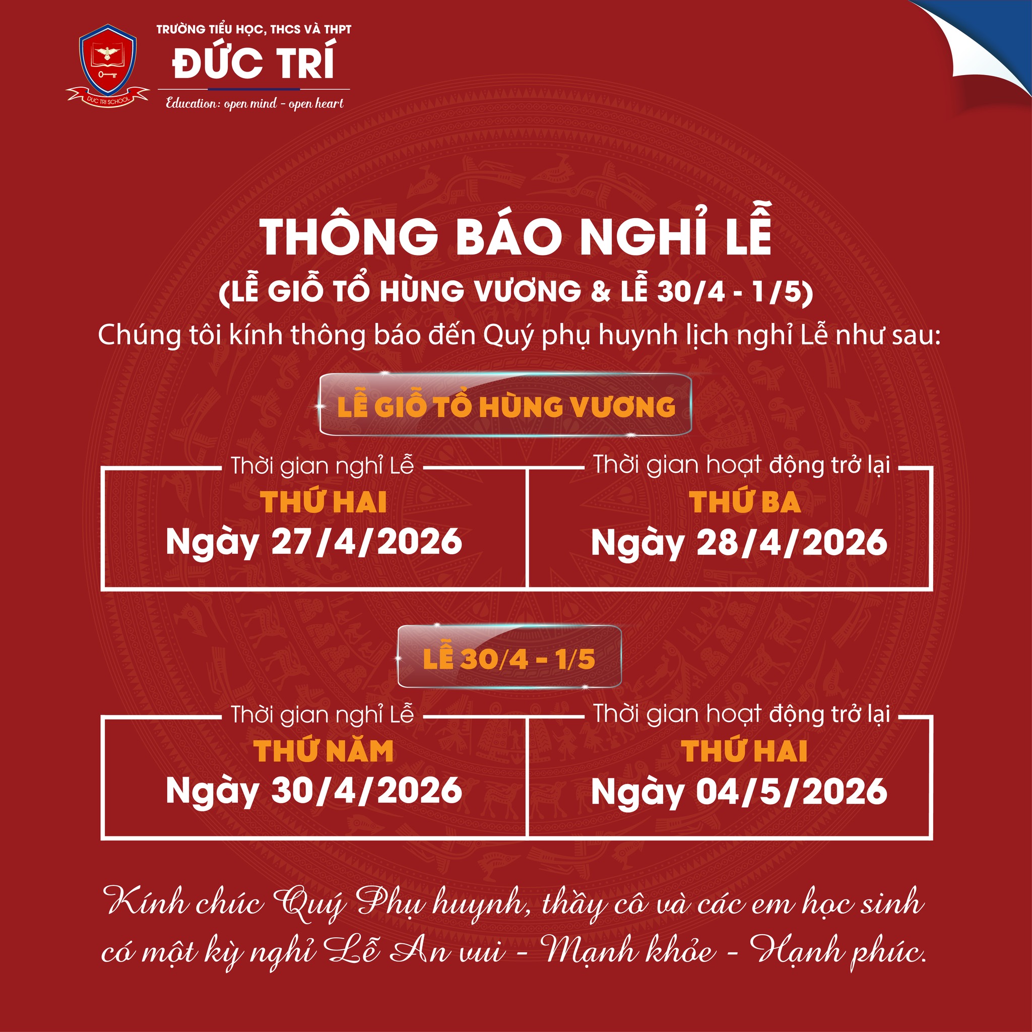 Trường Tiểu học, THCS và THPT Đức Trí xin trân trọng thông báo đến Quý phụ huynh, Quý thầy cô giáo, nhân viên và các em học sinh lịch nghỉ lễ sắp tới như sau: